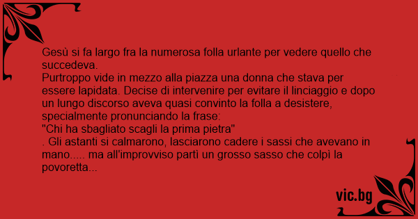 . Gli astanti si calmarono, lasciarono cadere i sassi che avevano in mano..... ma all'improvviso partì un grosso sasso che colpì la povoretta alla testa uccidendola. Gesù si voltò e vide Maria che si stava pulendo le mani.... allora Gesù disse :