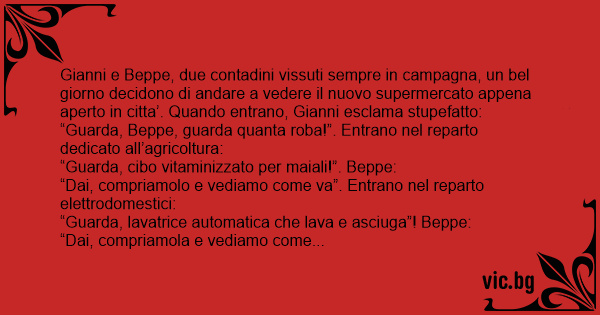 Gianni e Beppe, due contadini vissuti sempre in campagna, un bel giorno decidono di andare a vedere il nuovo supermercato appena aperto in citta’. Quando entrano, Gianni esclama stupefatto:
