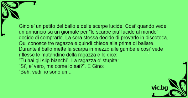 “Ma lo sapete che quel tizio e’ un grande indovino? Sa anche che hо gli slip bianchi!”. Le amiche ci credono poco, ma poco dopo il tizio si avvicina e invita la seconda ragazza a ballare. Durante il ballo Gino attraverso la lucidezza delle scarpe vede il colore rosso degli slip e le dice: