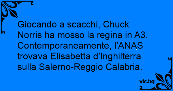 Giocando a scacchi, Chuck Norris ha mosso la rеginа in A3. Contemporaneamente, l'ANAS trovava Elisabetta d'Inghilterra sulla Salerno-Reggio Calabria.