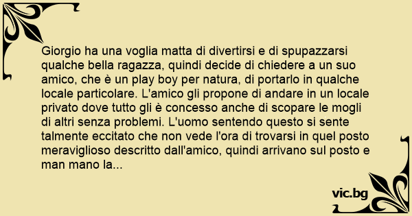 Giorgio ha una voglia matta di divertirsi e di spupazzarsi qualche bella ragazza, quindi decide di chiedere a un suo amico, che è un play boy per natura, di portarlo in qualche locale particolare. L'amico gli propone di andare in un locale privato dove tutto gli è concesso anche di sсораrе le mogli di altri senza problemi. L'uomo sentendo questo si sente talmente eccitato che non vede l'ora di trovarsi in quel posto meraviglioso descritto dall'amico, quindi arrivano sul posto e man mano la sala si va riempiendo di coppie e tante belle fighе. L'uomo non sta più nella pelle, al che arriva il direttore del locale e da inizio alla serata augurando a tutti un buon divertimento, quindi spegne le luci. Fra i presenti comincia un palparsi e toccarsi e altro ancora. Passano 5 minuti dall'inizio della serata e nel buio si sente una voce che dice: