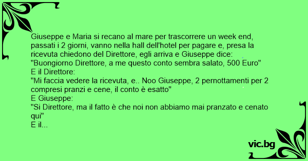 Giuseppe e Maria si recano al mare per trascorrere un week end, passati i 2 giorni, vanno nella hall dell'hotel per pagare e, presa la ricevuta chiedono del Direttore, egli arriva e Giuseppe dice: