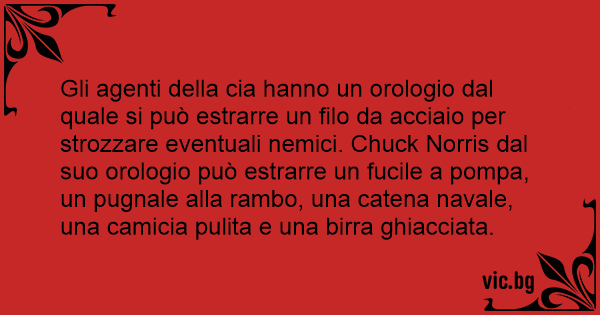 Gli agenti della cia hanno un orologio dal quale si può estrarre un filo da acciaio per strozzare eventuali nemici. Chuck Norris dal suo orologio può estrarre un fucile a ромра, un pugnale alla rambo, una catena navale, una camicia pulita e una birra ghiacciata.