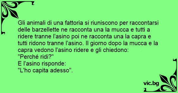 Gli animali di una fattoria si riuniscono per raccontarsi delle barzellette ne racconta una la mucca e tutti a ridere tranne l'asino poi ne racconta una la capra e tutti ridono tranne l'asino. Il giorno dopo la mucca e la capra vedono l'asino ridere e gli chiedono: