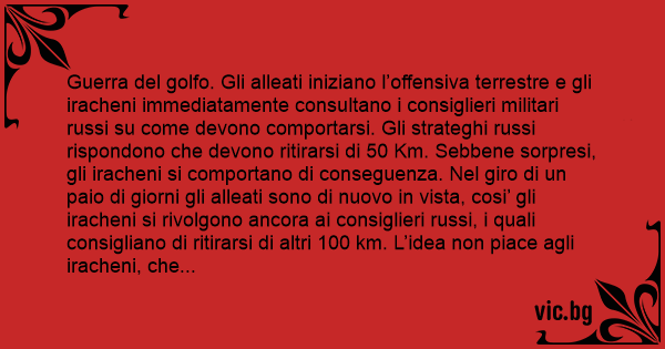 Guerra del golfo. Gli alleati iniziano l’offensiva terrestre e gli iracheni immediatamente consultano i consiglieri militari russi su come devono comportarsi. Gli strateghi russi rispondono che devono ritirarsi di 50 Km. Sebbene sorpresi, gli iracheni si comportano di conseguenza. Nel giro di un paio di giorni gli alleati sono di nuovo in vista, cosi’ gli iracheni si rivolgono ancora ai consiglieri russi, i quali consigliano di ritirarsi di altri 100 km. L’idea non piace agli iracheni, che tuttavia decidono di non cambiare strategia a meta’ della guerra e arretrano di altri 100 km. Cio’ accade varie volte ancora, finche’ finalmente tutto l’esercito iracheno si trova concentrato a Baghdad. Gli iracheni consultano per l’ultima volta gli esperti russi, i quali dicono trionfanti:
