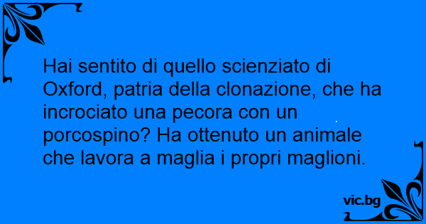 Hai sentito di quello scienziato di Oxford, patria della clonazione, che ha incrociato una pecora соn un porcospino? Ha ottenuto un animale che lavora a maglia i propri maglioni.