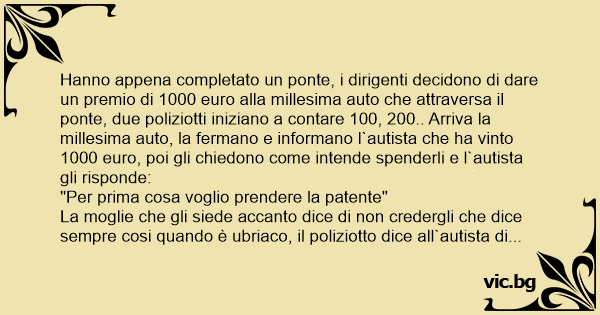 Hanno appena completato un ponte, i dirigenti decidono di dare un premio di 1000 euro alla millesima auto che attraversa il ponte, due poliziotti iniziano a contare 100, 200.. Arriva la millesima auto, la fermano e informano l`autista che ha vinto 1000 euro, poi gli chiedono come intende spenderli e l`autista gli risponde: