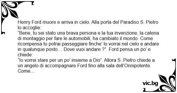 “Bene, tu sei stato una brava persona e la tua invenzione, la catena di montaggio per fare le automobili, ha cambiato il mondo. Come ricompensa tu potrai passeggiare finche’ lo vorrai nel cielo e andare in qualunque posto… Dove vuoi andare ?”. Ford pensa un po’ e chiede: