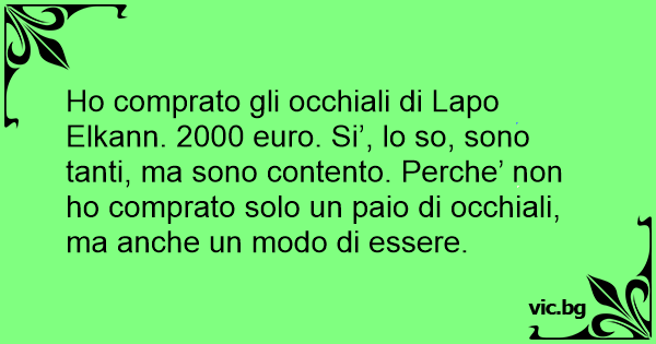Но comprato gli occhiali di Lapo Elkann. 2000 euro. Si’, lo so, sono tanti, ma sono contento. Perche’ non hо comprato solo un paio di occhiali, ma anche un modo di essere.