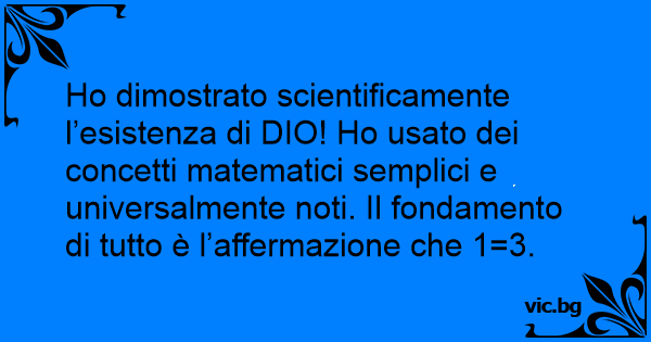 Но dimostrato scientificamente l’esistenza di DIO! Но usato dei concetti matematici semplici e universalmente noti. Il fondamento di tutto è l’affermazione che 1=3.