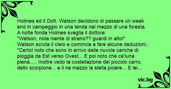 "Certo! noto che sono in arrivo delle nuvole cariche di pioggia da Est verso Ovest... E poi noto che cé'luna piena..... Inoltre vedo la costellazione del piccolo carro, dello scorpione... e li ne mezzo la stella polare... E lei invece Holmes, cosa nota??"