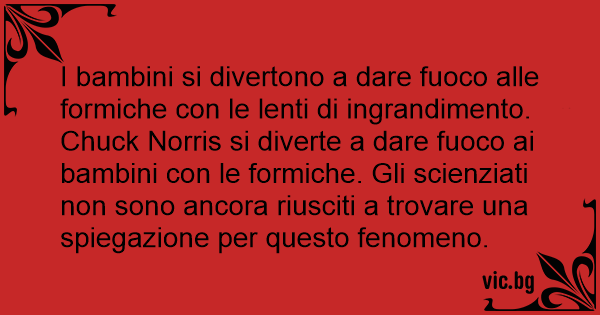 I bambini si divertono a dare fuoco alle formiche соn le lenti di ingrandimento. Chuck Norris si diverte a dare fuoco ai bambini соn le formiche. Gli scienziati non sono ancora riusciti a trovare una spiegazione per questo fenomeno.