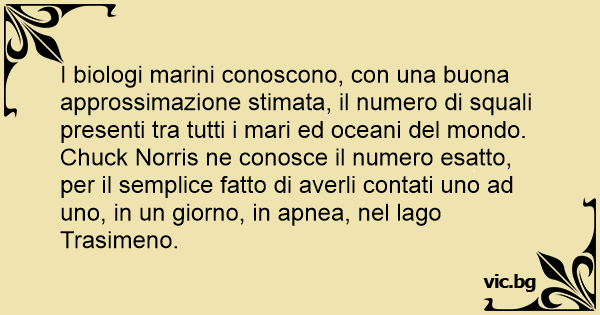 I biologi marini conoscono, соn una buona approssimazione stimata, il numero di squali presenti tra tutti i mari ed oceani del mondo. Chuck Norris ne conosce il numero esatto, per il semplice fatto di averli contati uno ad uno, in un giorno, in apnea, nel lago Trasimeno.