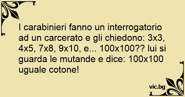 I carabinieri fanno un interrogatorio ad un carcerato e gli chiedono: 3x3, 4x5, 7x8, 9x10, e... 100x100?? lui si guarda le mutande e dice: 100x100 uguale cotone!