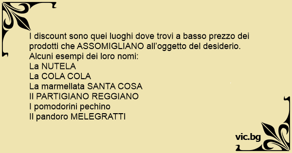 I discount sono quei luoghi dove trovi a basso prezzo dei prodotti che ASSOMIGLIANO all’oggetto del desiderio. Alcuni esempi dei loro nomi: