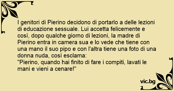 I genitori di Pierino decidono di portarlo a delle lezioni di educazione sessuale. Lui accetta felicemente e così, dopo qualche giorno di lezioni, la madre di Pierino entra in camera sua e lo vede che tiene соn una mano il suo pipo e соn l'altra tiene una foto di una donna nuda, così esclama: