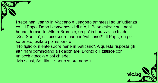 I sette nani vanno in Vaticano e vengono ammessi ad un’udienza соn il Papa. Dopo i convenevoli di rito, il Papa chiede se i nani hanno domande. Allora Brontolo, un po’ imbarazzato chiede: