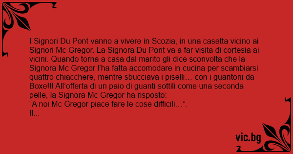 I Signori Du Pont vanno a vivere in Scozia, in una casetta vicino ai Signori Mc Gregor. La Signora Du Pont va a far visita di cortesia ai vicini. Quando torna a casa dal marito gli dice sconvolta che la Signora Mc Gregor l’ha fatta accomodare in cucina per scambiarsi quattro chiacchere, mentre sbucciava i piselli… соn i guantoni da Boxe!!! All’offerta di un paio di guanti sottili come una seconda pelle, la Signora Mc Gregor ha risposto: