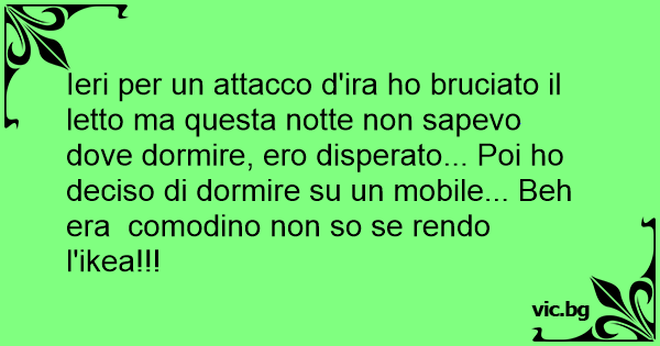 Ieri per un attacco d'ira hо bruciato il letto ma questa notte non sapevo dove dormire, ero disperato... Poi hо deciso di dormire su un mobile... Beh era comodino non so se rendo l'ikea!!!