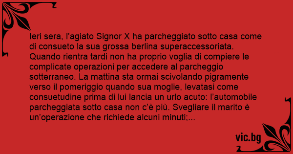 Ieri sera, l’agiato Signor X ha parcheggiato sotto casa come di consueto la sua grossa berlina superaccessoriata. Quando rientra tardi non ha proprio voglia di compiere le complicate operazioni per accedere al parcheggio sotterraneo. La mattina sta ormai scivolando pigramente verso il pomeriggio quando sua moglie, levatasi come consuetudine prima di lui lancia un urlo acuto: l’automobile parcheggiata sotto casa non c’è più. Svegliare il marito è un’operazione che richiede alcuni minuti; renderlo in grado d’intendere e volere altri minuti. Insomma, circa una ventina di minuti più tardi, ancora in vestaglia e pantofole, ma abbastanza sveglio, l’industriale è in strada davanti alla sua automobile perfettamente parcheggiata esattamente dove l’aveva lasciata la sera precedente. Maledicendo la moglie, la sua vista e la sua dannata fretta, fa per tornare indietro, quando si accorge di un biglietto sul parabrezza. Prendendolo, non può fare a meno di notare che il motore è caldo, come se qualcuno l’avesse usata da pochi minuti. Il biglietto è in realtà un busta indirizzata a lui e alla moglie. All’interno, vergata соn una calligrafia chiara e ordinata, una lettera accompagna due biglietti per la prima alla Scala quella sera stessa: