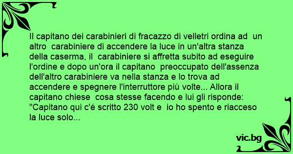 Il capitano dei carabinieri di fracazzo di velletri ordina ad un altro carabiniere di accendere la luce in un'altra stanza della caserma, il carabiniere si affretta subito ad eseguire l'ordine e dopo un'ora il capitano preoccupato dell'assenza dell'altro carabiniere va nella stanza e lo trova ad accendere e spegnere l'interruttore più volte... Allora il capitano chiese cosa stesse facendo e lui gli risponde: