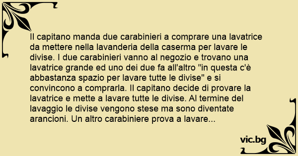 Il capitano manda due carabinieri a comprare una lavatrice da mettere nella lavanderia della caserma per lavare le divise. I due carabinieri vanno al negozio e trovano una lavatrice grande ed uno dei due fa all'altro "in questa c'è abbastanza spazio per lavare tutte le divise" e si convincono a comprarla. Il capitano decide di provare la lavatrice e mette a lavare tutte le divise. Al termine del lavaggio le divise vengono stese ma sono diventate arancioni. Un altro carabiniere prova a lavare le divise e vengono perfette, il capitano si stupisce e gli chiede: