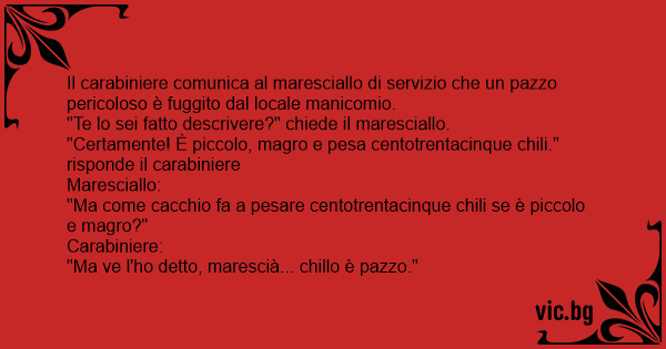 Il carabiniere comunica al maresciallo di servizio che un pazzo pericoloso è fuggito dal locale manicomio.