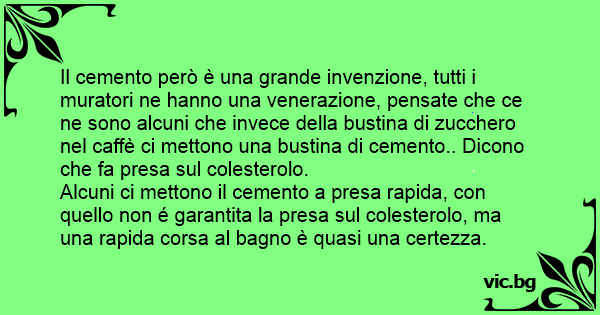 Il cemento però è una grande invenzione, tutti i muratori ne hanno una venerazione, pensate che ce ne sono alcuni che invece della bustina di zucchero nel caffè ci mettono una bustina di cemento.. Dicono che fa presa sul colesterolo.