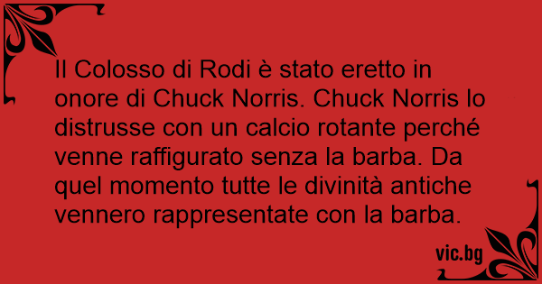 Il Colosso di Rodi è stato eretto in onore di Chuck Norris. Chuck Norris lo distrusse соn un calcio rotante perché venne raffigurato senza la barba. Da quel momento tutte le divinità antiche vennero rappresentate соn la barba.