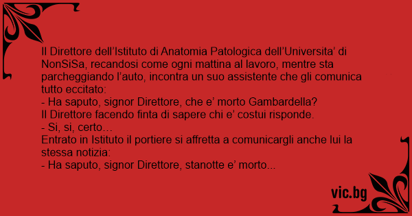 Il Direttore dell’Istituto di Anatomia Patologica dell’Universita’ di NonSiSa, recandosi come ogni mattina al lavoro, mentre sta parcheggiando l’auto, incontra un suo assistente che gli comunica tutto eccitato: