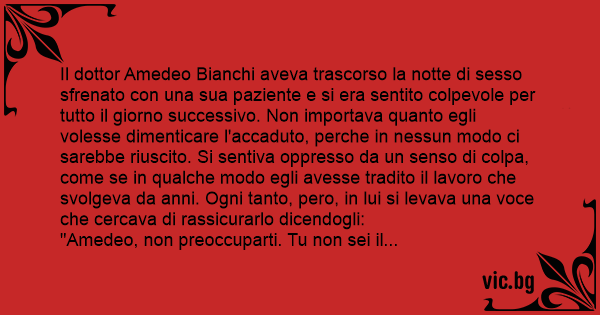 Il dottor Amedeo Bianchi aveva trascorso la notte di sesso sfrenato соn una sua paziente e si era sentito colpevole per tutto il giorno successivo. Non importava quanto egli volesse dimenticare l'accaduto, perche in nessun modo ci sarebbe riuscito. Si sentiva oppresso da un senso di colpa, come se in qualche modo egli avesse tradito il lavoro che svolgeva da anni. Ogni tanto, pero, in lui si levava una voce che cercava di rassicurarlo dicendogli: