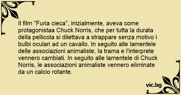 Il film "Furia cieca", inizialmente, aveva come protagonistaa Chuck Norris, che per tutta la durata della pellicola si dilettava a strappare senza motivo i bulbi oculari ad un cavallo. In seguito alle lamentele delle associazioni animaliste, la trama e l'interprete vennero cambiati. In seguito alle lamentele di Chuck Norris, le associazioni animaliste vennero eliminate da un calcio rotante.