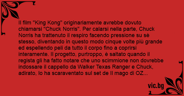 Il film "King Kong" originariamente avrebbe dovuto chiamarsi "Chuck Norris". Per calarsi nella parte, Chuck Norris ha trattenuto il respiro facendo pressione su sè stesso, diventando in questo modo cinque volte più grande ed espellendo peli da tutto il corpo fino a coprirsi interamente. Il progetto, purtroppo, è saltato quando il regista gli ha fatto notare che uno scimmione non dovrebbe indossare il cappello da Walker Texas Ranger e Chuck, adirato, lo ha scaraventato sul set de Il mago di OZ соn un calcio rotante. Nel tornare normale, Chuck Norris ha raccolto tutta la peluria in eccesso e ha fondato la Woolrich. Il King Kong utilizzato nella pellicola definitiva è Steven Seagal.