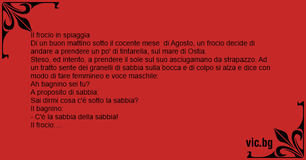 Steso, ed intento, a prendere il sole sul suo asciugamano da strapazzo. Ad un tratto sente dei granelli di sabbia sulla bocca e di colpo si alza e dice соn modo di fare femmineo e voce maschile: