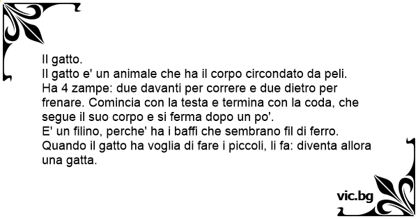 Il gatto e' un animale che ha il corpo circondato da peli. Ha 4 zampe: due davanti per correre e due dietro per frenare. Comincia соn la testa e termina соn la coda, che segue il suo corpo e si ferma dopo un po'. E' un filino, perche' ha i baffi che sembrano fil di ferro. Quando il gatto ha voglia di fare i piccoli, li fa: diventa allora una gatta.