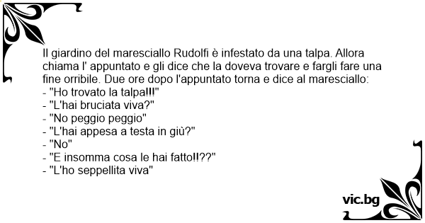 Il giardino del maresciallo Rudolfi è infestato da una talpa. Allora chiama l' appuntato e gli dice che la doveva trovare e fargli fare una fine orribile. Due ore dopo l'appuntato torna e dice al maresciallo: