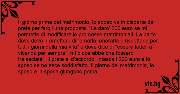 Il giorno prima del matrimonio, lo sposo va in disparte dal рrете per fargli una proposta. “Le daro’ 200 euro se mi permette di modificare le promesse matrimoniali. La parte dove devo promettere di “amarla, onorarla e rispettarla per tutti i giorni della mia vita” e dove dice di “essere fedeli a vicenda per sempre”, mi piacerebbe che fossero tralasciate”. Il рrете e’ d’accordo: intasca i 200 euro e lo sposo se ne esce soddisfatto. Il giorno del matrimonio, lo sposo e la sposa giungono per la loro cerimonia. Arriva il momento delle promesse reciproche, il pastore guarda lo sposo e gli fa: