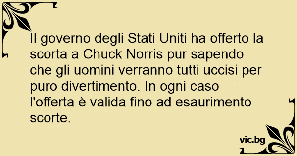 Il governo degli Stati Uniti ha offerto la scorta a Chuck Norris pur sapendo che gli uomini verranno tutti uccisi per puro divertimento. In ogni caso l'offerta è valida fino ad esaurimento scorte.