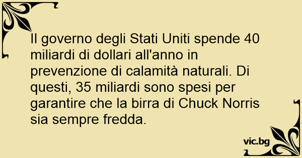 Il governo degli Stati Uniti spende 40 miliardi di dollari all'anno in prevenzione di calamità naturali. Di questi, 35 miliardi sono spesi per garantire che la birra di Chuck Norris sia sempre fredda.