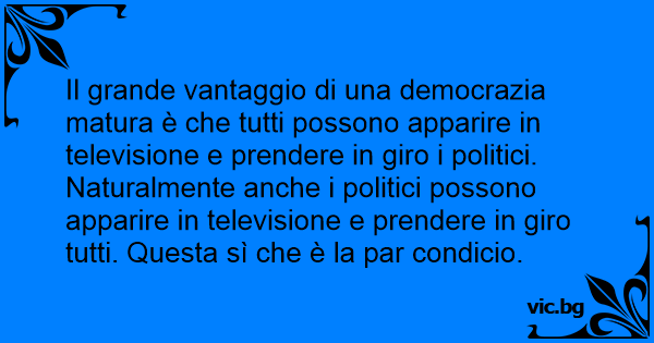 Il grande vantaggio di una democrazia matura è che tutti possono apparire in televisione e prendere in giro i politici. Naturalmente anche i politici possono apparire in televisione e prendere in giro tutti. Questa sì che è la par condicio.
