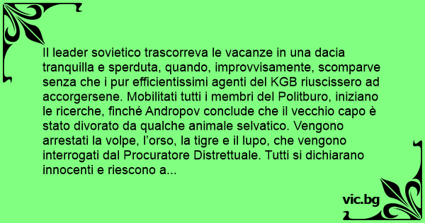 Il leader sovietico trascorreva le vacanze in una dacia tranquilla e sperduta, quando, improvvisamente, scomparve senza che i pur efficientissimi agenti del KGB riuscissero ad accorgersene. Mobilitati tutti i membri del Politburo, iniziano le ricerche, finché Andropov conclude che il vecchio capo è stato divorato da qualche animale selvatico. Vengono arrestati la volpe, l’orso, la tigre e il lupo, che vengono interrogati dal Procuratore Distrettuale. Tutti si dichiarano innocenti e riescono a fornire varie prove a discarico. Tutti, tra l’altro, sembrano piuttosto magrolini. Il Procuratore sarebbe propenso ad archiviare il caso, ma interviene il Procuratore Generale che passa a metodi più sbrigativi e minaccia serie punizioni per ogni forma di omertà. Anche questa volta il lupo, l’orso e la tigre riescono a farla franca. Ovvio, dunque, che il Magistrato voglia torchiare a fondo la volpe, nota per la sua astuzia e per non pochi precedenti penali. Il Giudice, pertanto, minaccia la volpe, dicendole che, se non parlerà, le farà scontare la pena per revoca di precedenti benefici. A questo punto la volpe sbotta: