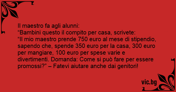 “Il mio maestro prende 750 euro al mese di stipendio, sapendo che, spende 350 euro per la casa, 300 euro per mangiare, 100 euro per spese varie e divertimenti. Domanda: Come si può fare per essere promossi?” – Fatevi aiutare anche dai genitori!