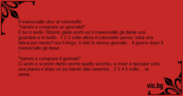 E lui ci andò. Ritornò glielo portò ed il maresciallo gli diede una guardata e lo buttò...1 2 3 volte allora il colonnello pensò: tutta una fatica per niente? mo ti frego, ti ridò lo stesso giornale... Il giorno dopo il maresciallo gli disse: