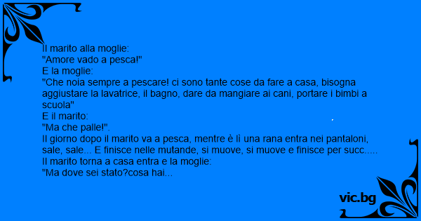Il giorno dopo il marito va a pesca, mentre è lì una rana entra nei pantaloni, sale, sale... E finisce nelle mutande, si muove, si muove e finisce per succ.....