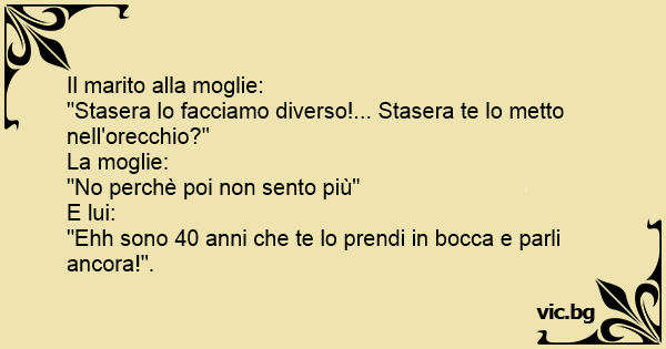 Il marito alla moglie: "Stasera lo facciamo diverso!... Stasera te lo metto nell'orecchio?" La moglie: "No perchè poi non sento più" E lui: "Ehh sono 40 anni che te lo prendi in bocca e parli ancora!".