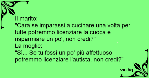 Lui: Cara, se tu imparassi a far bene da mangiare, potremmo licenziare la colf e sarebbe un bel risparmio! Lei: Certo, ma se tu imparassi a far bene l’amore, potremmo risparmiare sull’idraulico e...