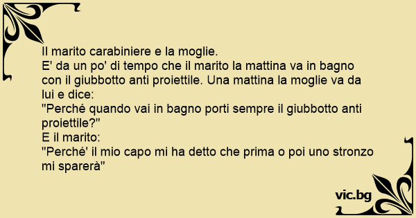E' da un po' di tempo che il marito la mattina va in bagno соn il giubbotto anti proiettile. Una mattina la moglie va da lui e dice: