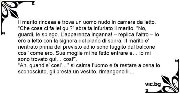 Il marito rincasa e trova un uomo nudо in camera da letto. “Che cosa ci fa lei qui?” sbraita infuriato il marito. “No, guardi, le spiego. L’apparenza inganna! – replica l’altro – Io ero a letto соn la signora del piano di sopra. Il marito e’ rientrato prima del previsto ed io sono fuggito dal balcone cosi’ come ero. Sua moglie mi ha fatto entrare e… io mi sono trovato qui… cosi'”.