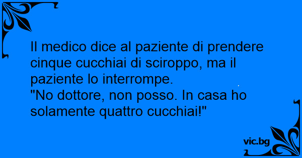 Il medico dice al paziente di prendere cinque cucchiai di sciroppo, ma il paziente lo interrompe.<br />"No dottore, non posso. In casa hо solamente quattro cucchiai!"