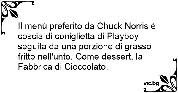 Il menù preferito da Chuck Norris è coscia di coniglietta di Рlаyвоy seguita da una porzione di grasso fritto nell'unto. Come dessert, la Fabbrica di Cioccolato.